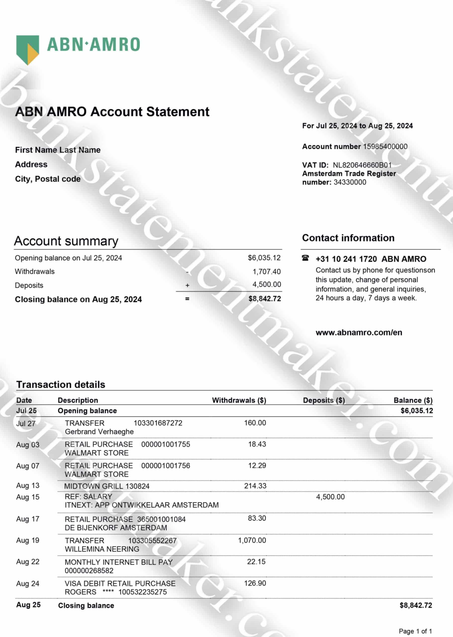 Disclaimer: All templates are for novelty, demonstration, UX, and educational use only. We do not support any misuse or fraud. This product is not affiliated with ABN AMRO Bank N.V.
