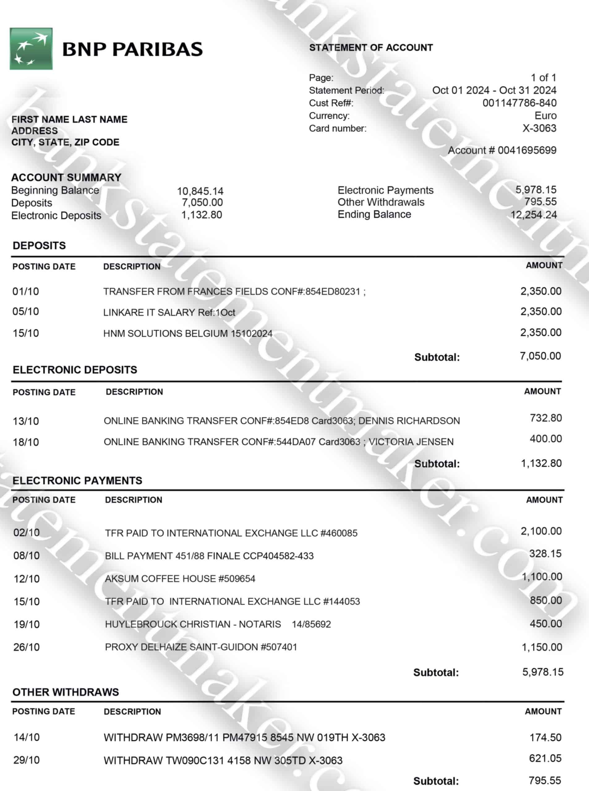 Need a lifelike and editable BNP Paribas Belgium bank statement template? Whether you’re working on a personal finance project, creating a UX prototype, or assembling visual assets for creative work — this custom PDF bank statement template is designed to simulate a real BNP Paribas Belgium document with precision and flexibility.