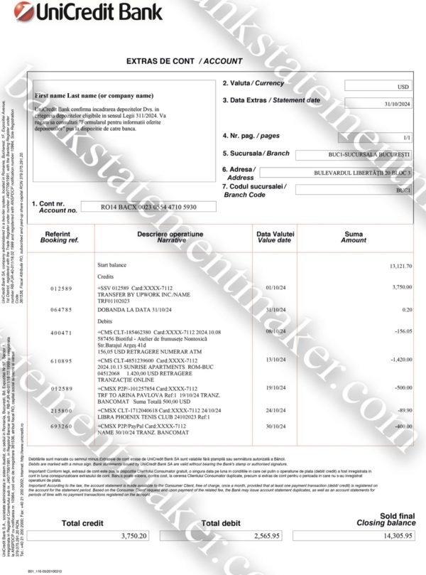 In today’s fast-paced financial world, having accurate and personalized financial documentation can make all the difference. Whether you’re applying for a loan, undergoing financial verification, or simply needing a detailed account summary, having a bank statement that fits your specific needs is crucial. At Bankstatementmaker LLC, we offer a top-tier Custom Bank Statement Service tailored for those needing a UniCredit Romania bank statement template. Our service provides tailored statements with your personalized information, ensuring accuracy and privacy, backed by over 12 years of industry experience.